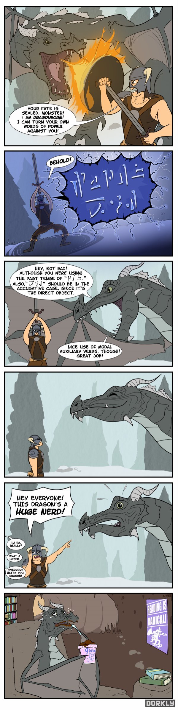 Posted in Webcomic Skyrim Dragons Are Grammar Nerds Geek World Order November 14, 2011 Leave a comment Skyrim Comic from the people over at Dorkly Author: Geek World Order Related Articles A Tale of Two Gamers Sonic’s Crazy Eye Infection FPS vs. RPG Nobody Likes Spider-Man At Metal Shows